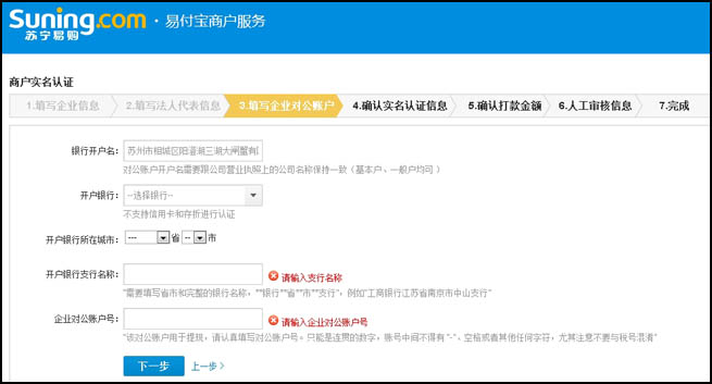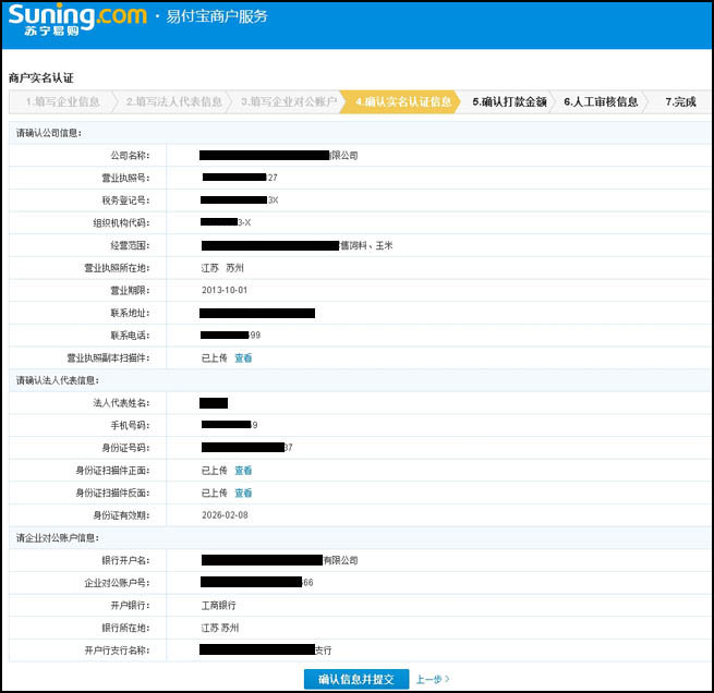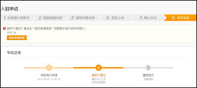 1)审核不通过,商家登陆苏宁生活商家入驻平台点击审核进度查询页面进行查询,点击“修改申请信息”,重新填写商户信息并提交。