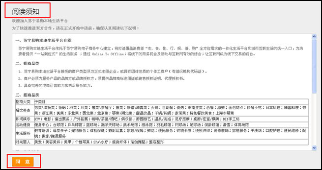 2、 登录后进行商家入驻,阅读入驻须知。点击“同意”,进入下一步。