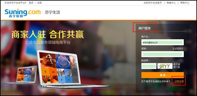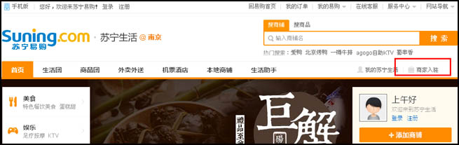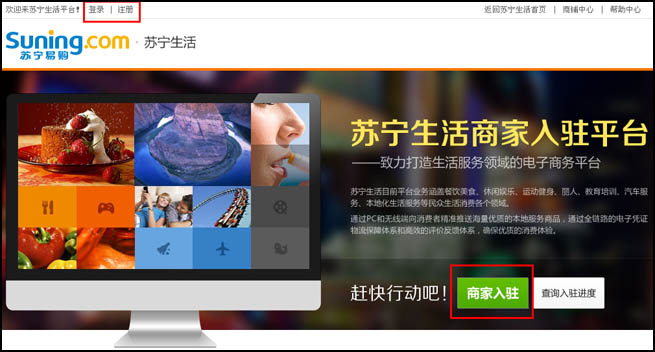 1、进入苏宁生活首页,点击“商家入驻”进入苏宁生活商家入驻平台,详细了解本地生活平台招商标准后,点击“商家入驻”,进行注册。