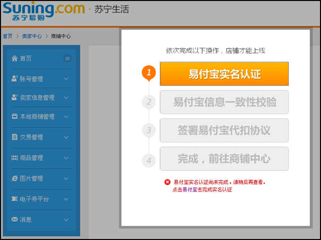 8、重新登录,进入商铺中心,完成易付宝是实名认证。