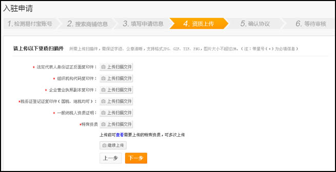 5、资质上传,所有资质复印件需盖章扫描后上传,上传后点击“下一步”。