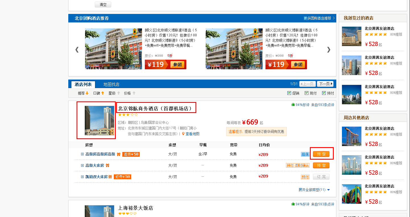 选定房型后,点右侧的“预订”按钮(橙色按钮表示房间可预订;灰色表示暂时不可预订),开始填写酒店预订单。若酒店不符条件,可以重新筛选。