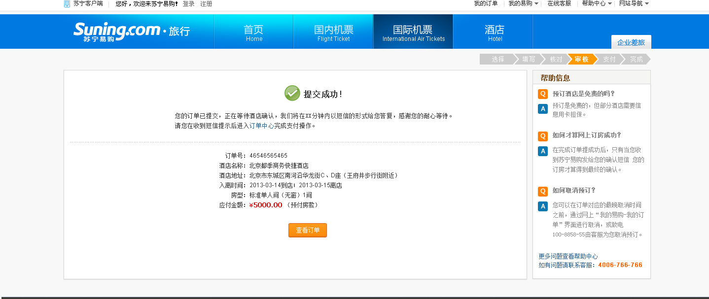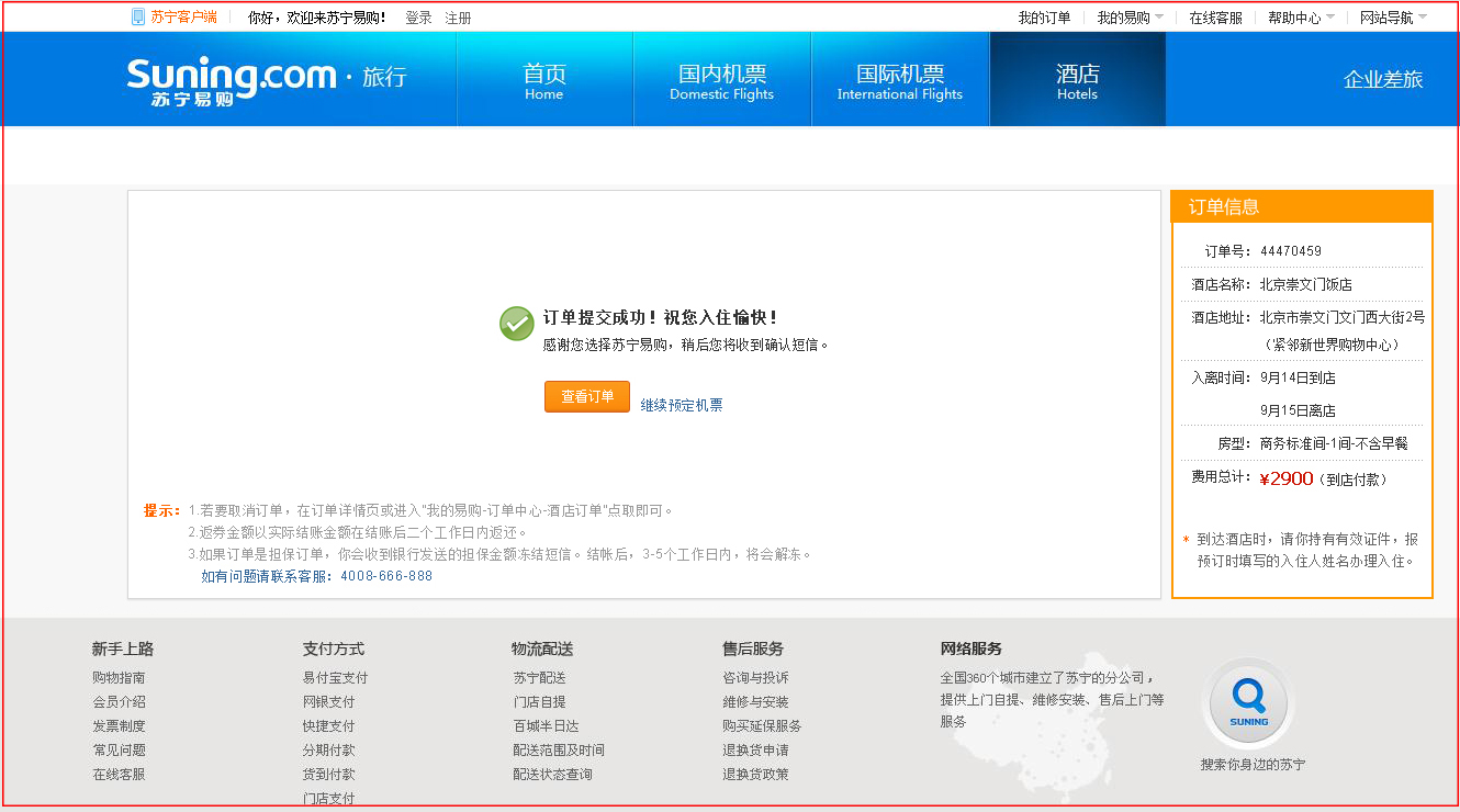 您只有收到苏宁易购的订单确认短信才表示酒店预定成功。如果您在1小时内仍没有收到确认信,请咨询在线客服4006-766-766.