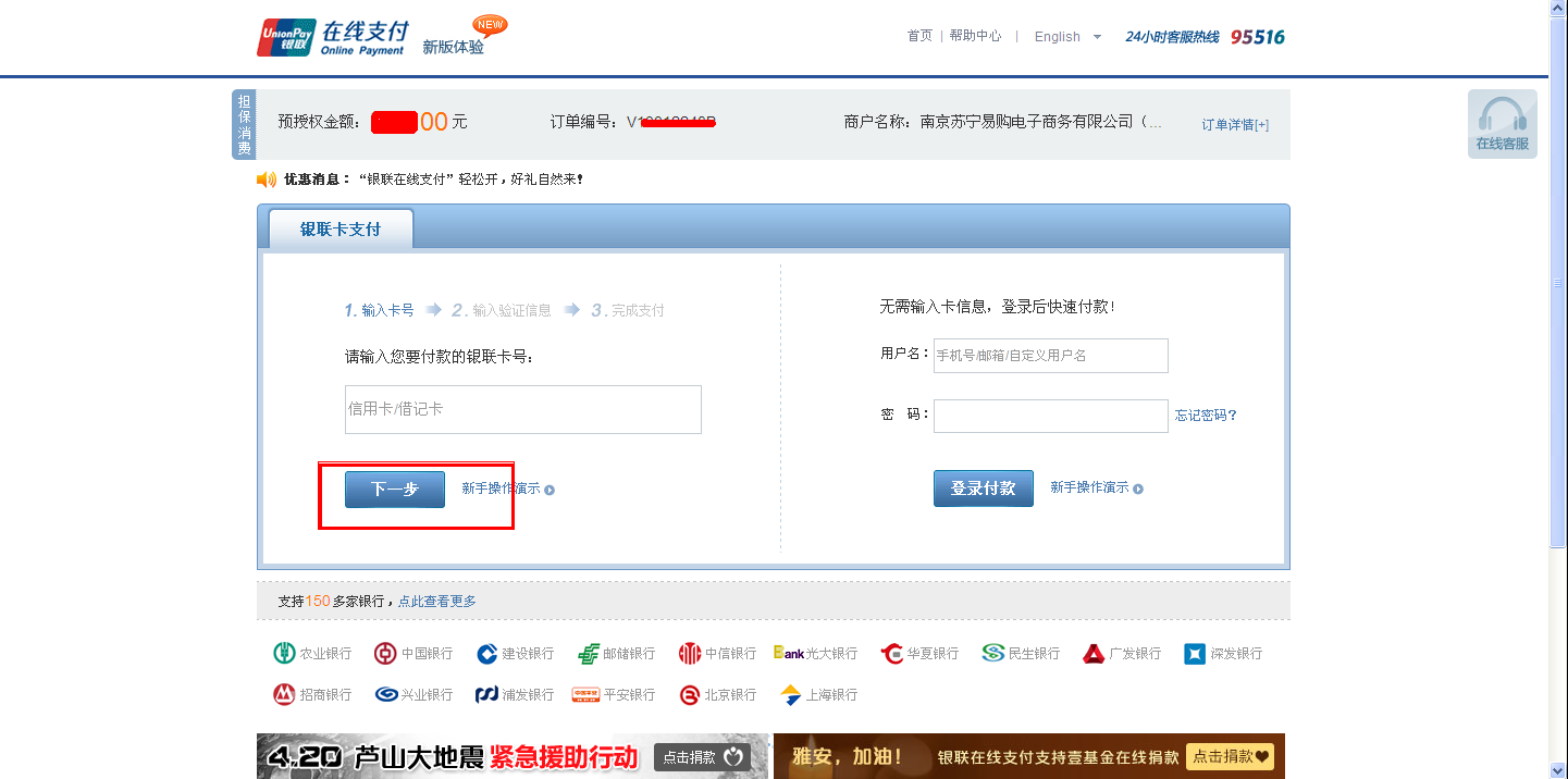 (2) 如果出现信用卡超额透支、存折余额不足、意外断线等导致支付不成功,请您登录苏宁易购"我的帐户",找到该张未支付成功的订单,重新完成支付。