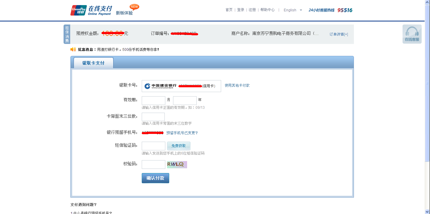 (4)为了便于订单出现问题时,苏宁能第一时间通知到您,请您在提交信用卡信息后保证手机畅通,直到您成功收到我们的确认信息,感谢您的配合。