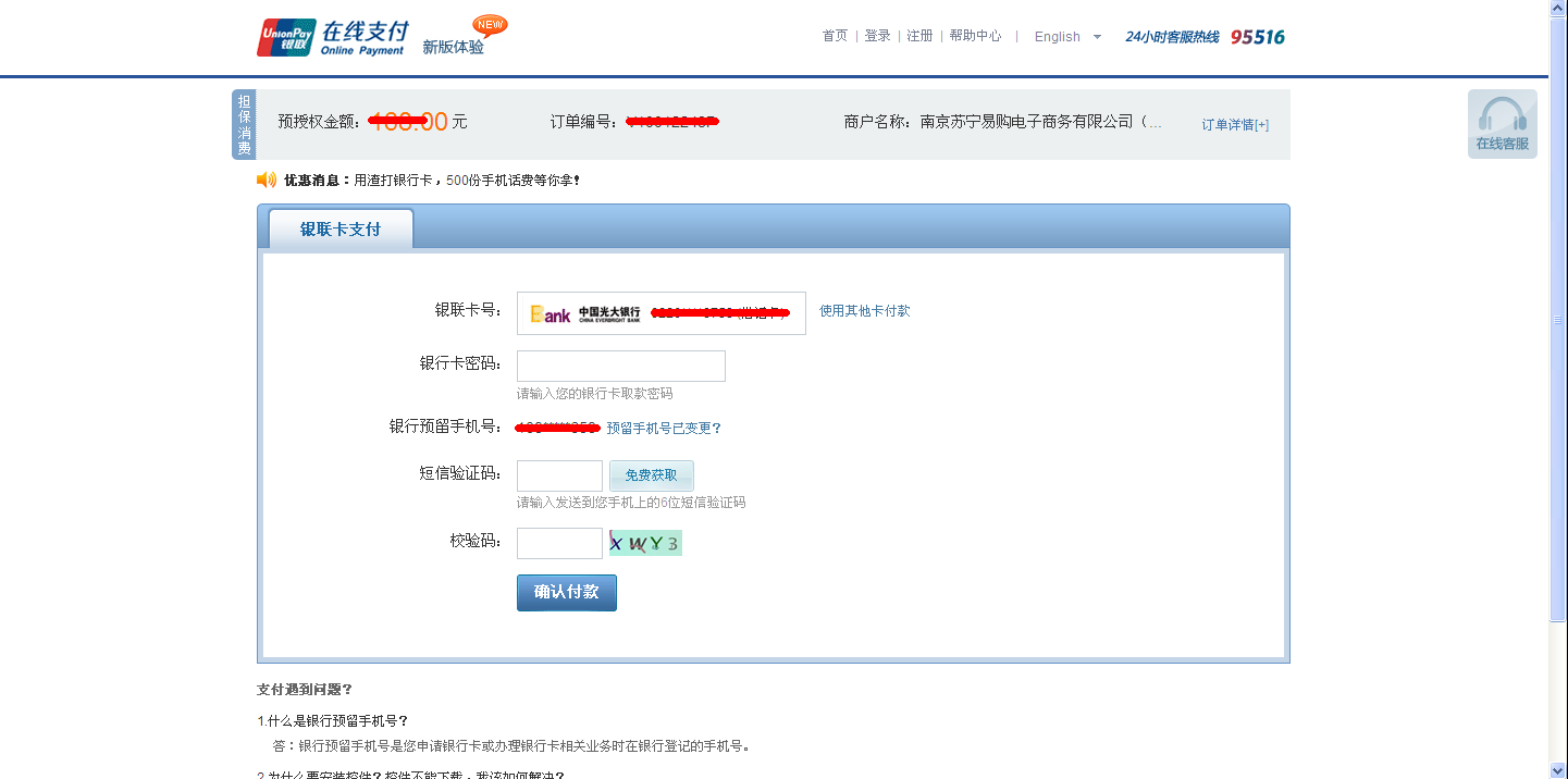 若您选择的是信用卡,则进一步填写信用卡有效期、信用卡背面的末三位数字、银行预留手机短信验证码、校验码等,填写完整后点击“确认付款”即可。